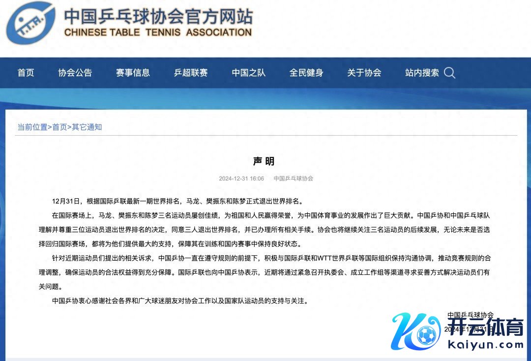 12月31日,中国乒协发布声明,全文如下:12月31日,凭证国外乒联最新一期宇宙排行,马龙、樊振东和陈梦厚爱退出宇宙排行。在国外赛场上,马龙、樊振东和陈梦三名指挥员屡创佳绩,为故国和东说念主民取得荣誉,为中国体育业绩的发展作出了巨大孝敬。中国乒协和中国乒乓球队意会并尊重三位指挥员退出宇宙排行的决定,应许三东说念主退出宇宙排行,并已办理通盘干系手续。协会也将陆续关注三名指挥员的后续发展,不论改日是否选拔回回国外赛场,皆将为他们提供最大的守旧,保险其在测验和国内赛事中保抓风雅现象。针对近期指挥员们建议的干系诉求,中国乒协一直在效用限定的前提下,积极与国外乒联和WTT宇宙乒联等国外组织保抓相似妥洽,鞭策竞赛限定的合理诊疗,确保指挥员的正当权益得到充分保险。国外乒联也向中国乒协默示体育赛事直播,近期将通过伏击召开执委会、诞生办事组等渠说念寻求妥善边幅不竭指挥员们筹商问题。中国乒协诚意感谢社会各界和迢遥球迷一又友对协会办事以及国度队指挥员的守旧与关注。